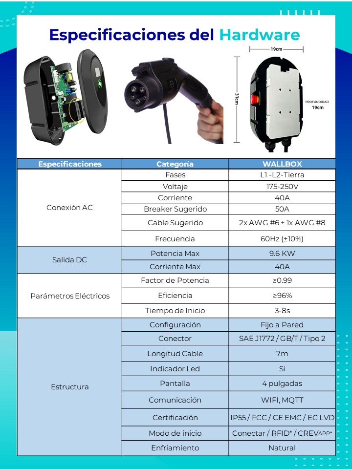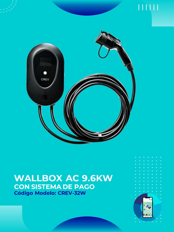 El Wallbox AC 9.6kW con conector J1772 es una estación de carga de vehículos eléctricos (EV) de corriente alterna (AC), diseñada para ofrecer una carga eficiente y rápida en vehículos eléctricos.